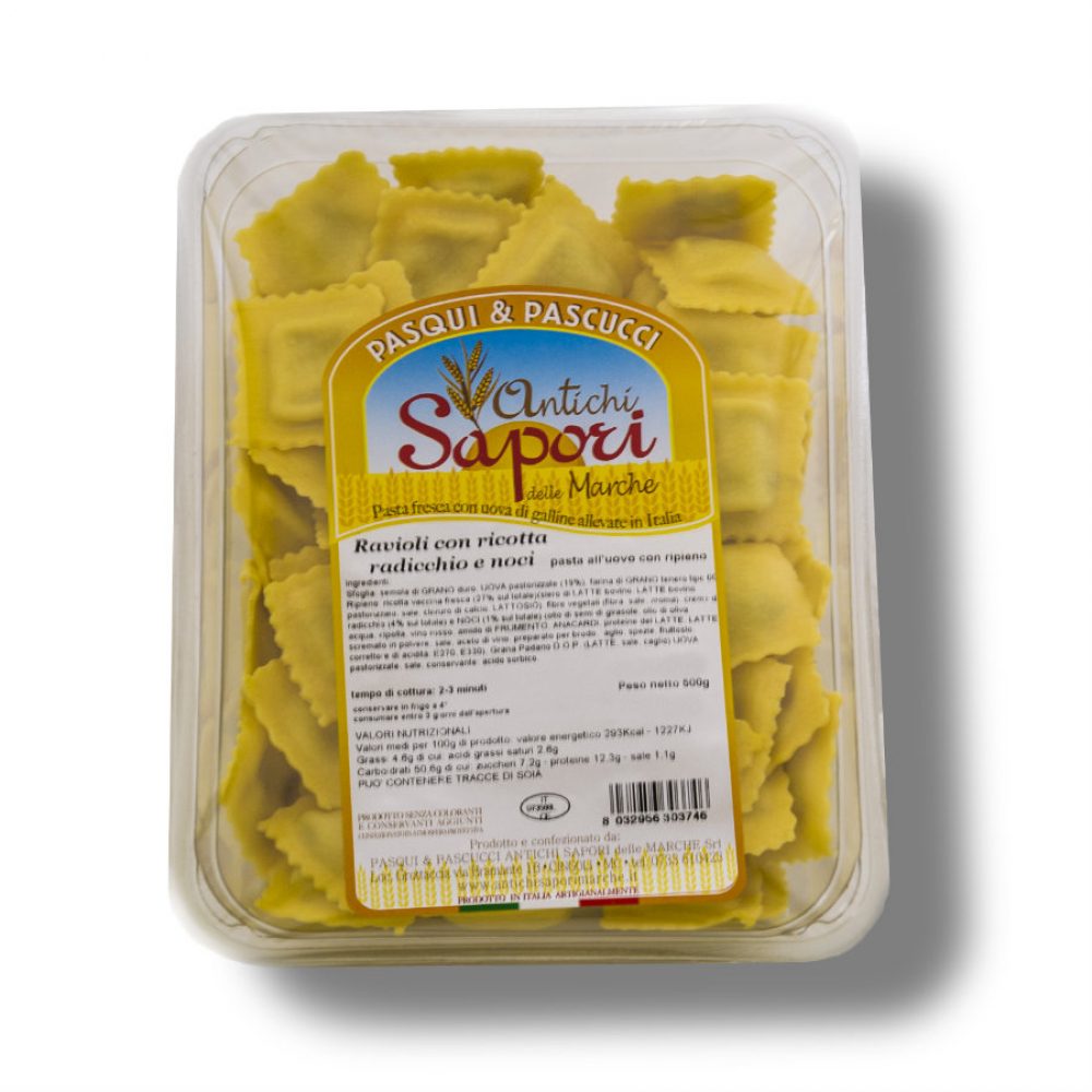 Di forma quadrata e dal colore inconfondibile, i ravioli ripieni col metodo Antichi Sapori delle Marche, prevedono esclusivamente ricotta proveniente da ovini e bovini marchigiani. Il pastificio cingolano infatti, mantiene saldo da sempre, un forte legame con il proprio territorio anche attraverso l’utilizzo, di materie prime d’eccellenza. In questa variante, la pasta fresca all’uovo e la ricotta del ripieno, sono abbinate a radicchio e noci: ottimi da consumare anche su basi vellutate.