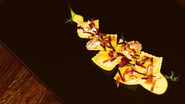 Far soffriggere con olio evo, in una padella: Guanciale, radicchio rosso e tenere da parte. Per la salsa allo zenzero: Fare un'infusione di zenzero in polvere e panna fresca, scaldare in un pentolino e tenere da parte. Cuocere i Ravioli ripieni di ricotta, radicchio e noci Antichi Sapori delle Marche in abbondante acqua salata, saltarli con radicchio, guanciale ed aggiungere le noci; impiattare e cospargere i ravioli con la salsa allo zenzero.